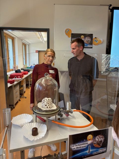 Im Physikraum konnten Spannungen erforscht, kleine Elektromotoren untersucht und Magnetfelder erkundet werden. Das Highlight des Physikraumes war allerdings der „heiße Draht“. Es gelang nur einigen wenigen, den Parcours fehlerlos zu bewältigen. Als Belohnung gab es Süßigkeiten zu gewinnen. Aber auch der riesige Schaumkuss sorgte für Begeisterung.